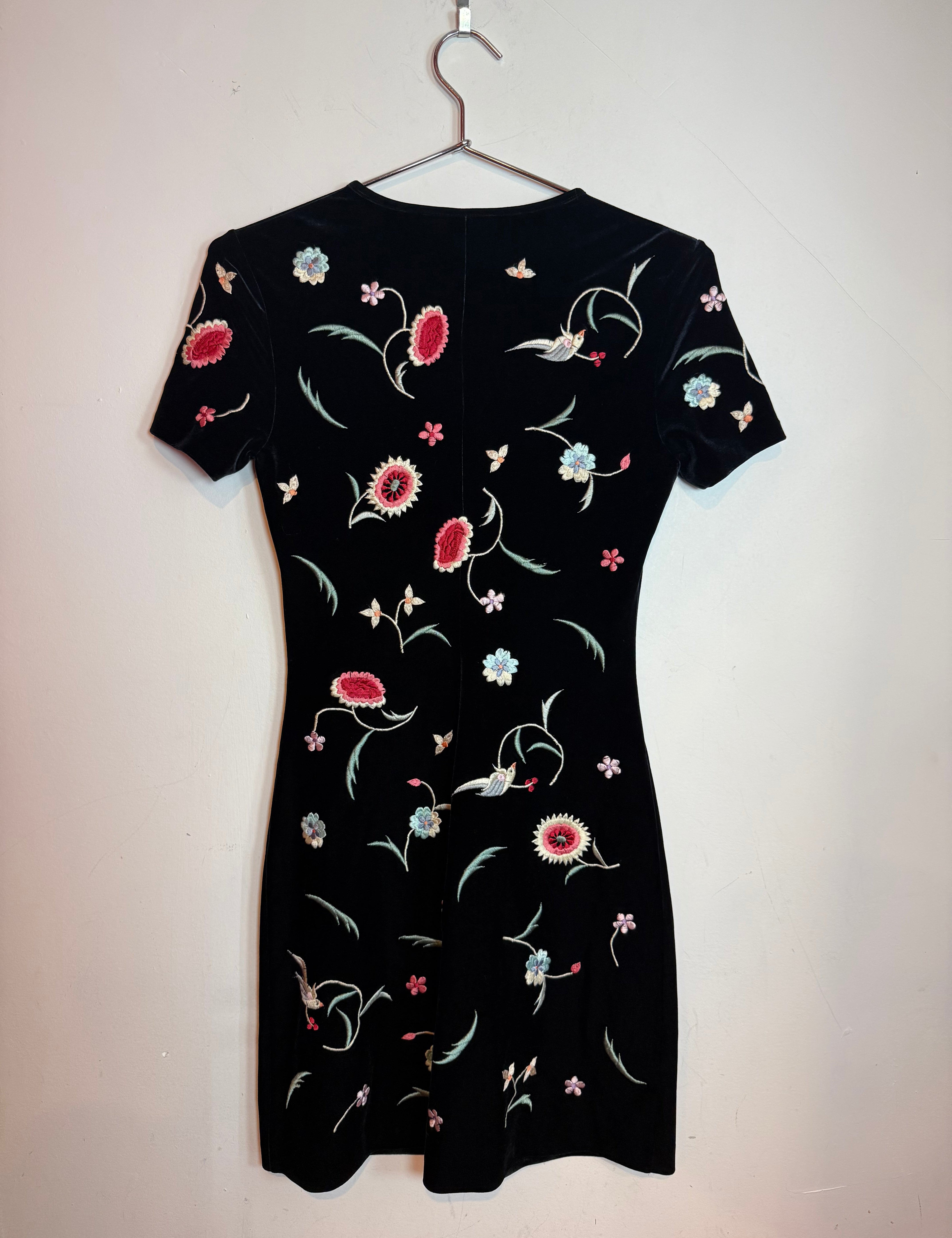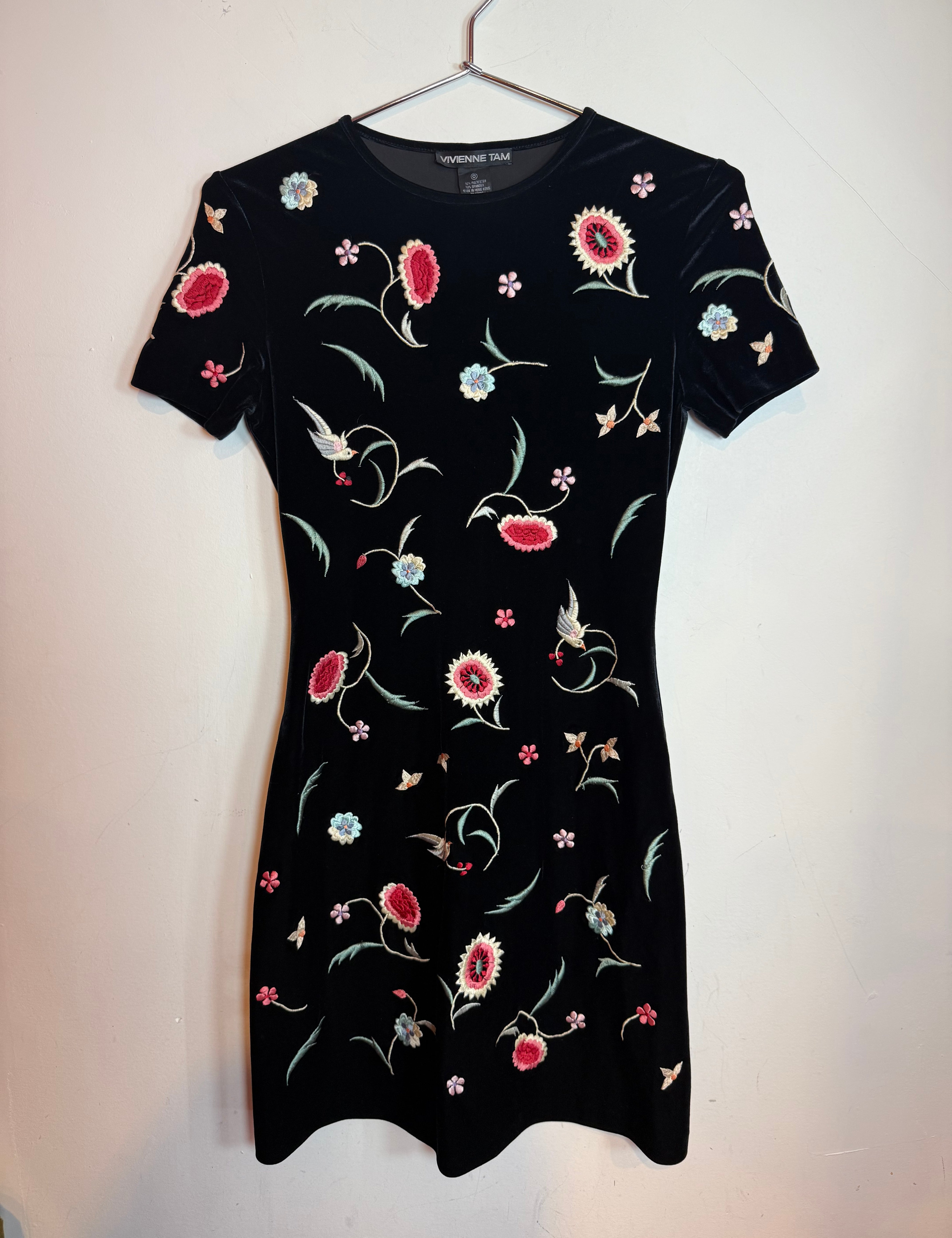 Vintage Vivienne Tam Black Velvet Mini Dress Embroidered Floral