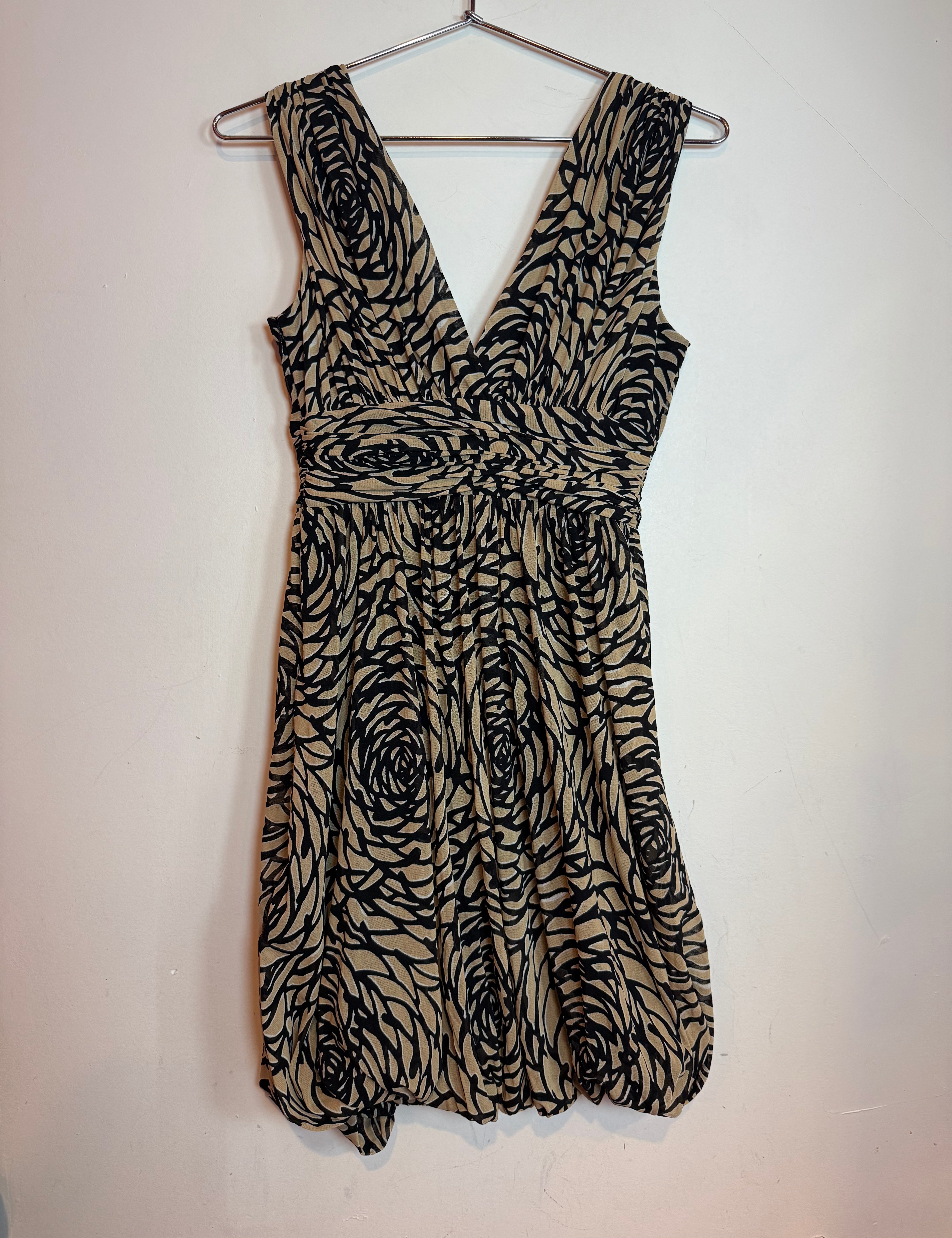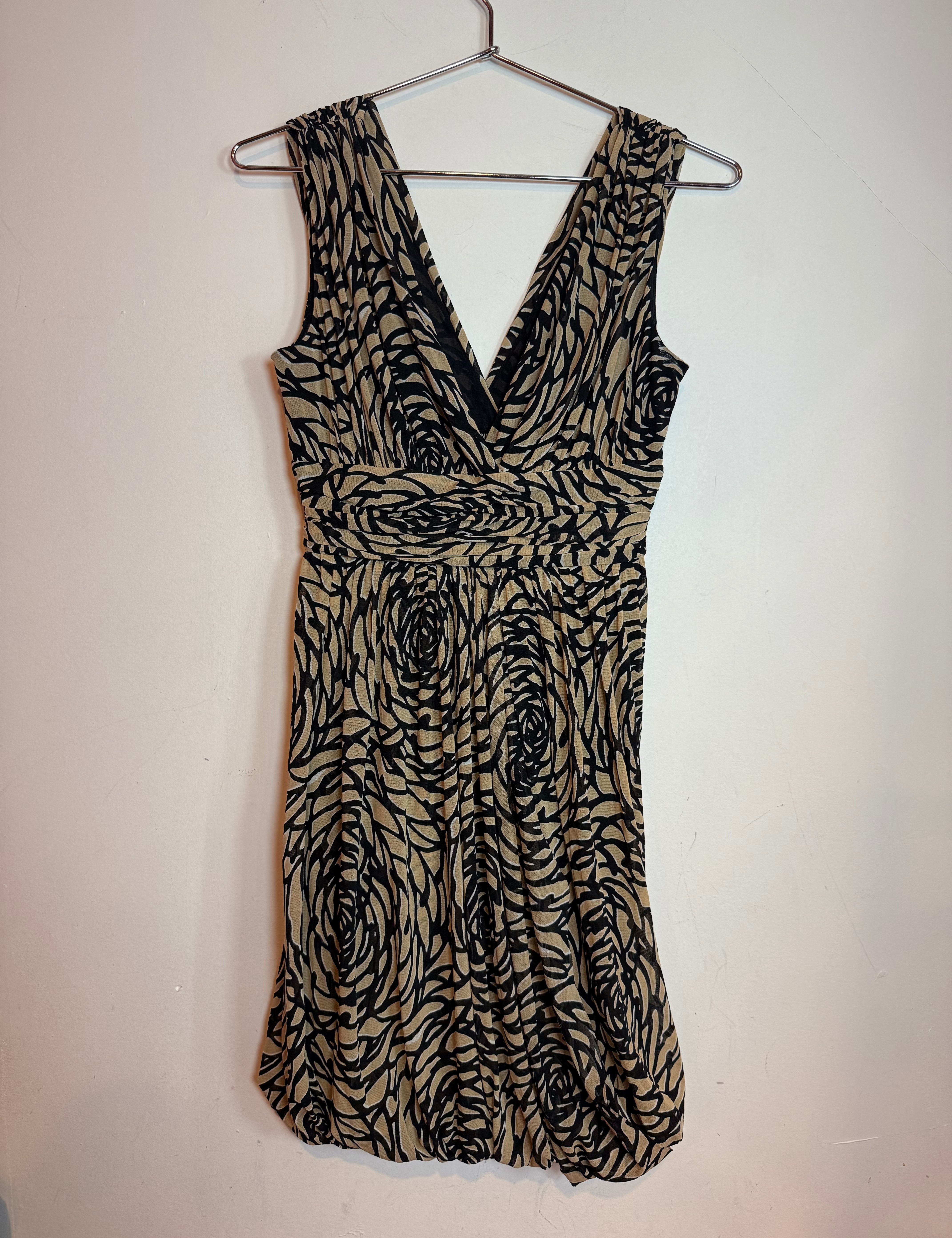 Vintage Vivienne Tam Tan Black Floral Swirl Print Sleeveless V-Neck Dress