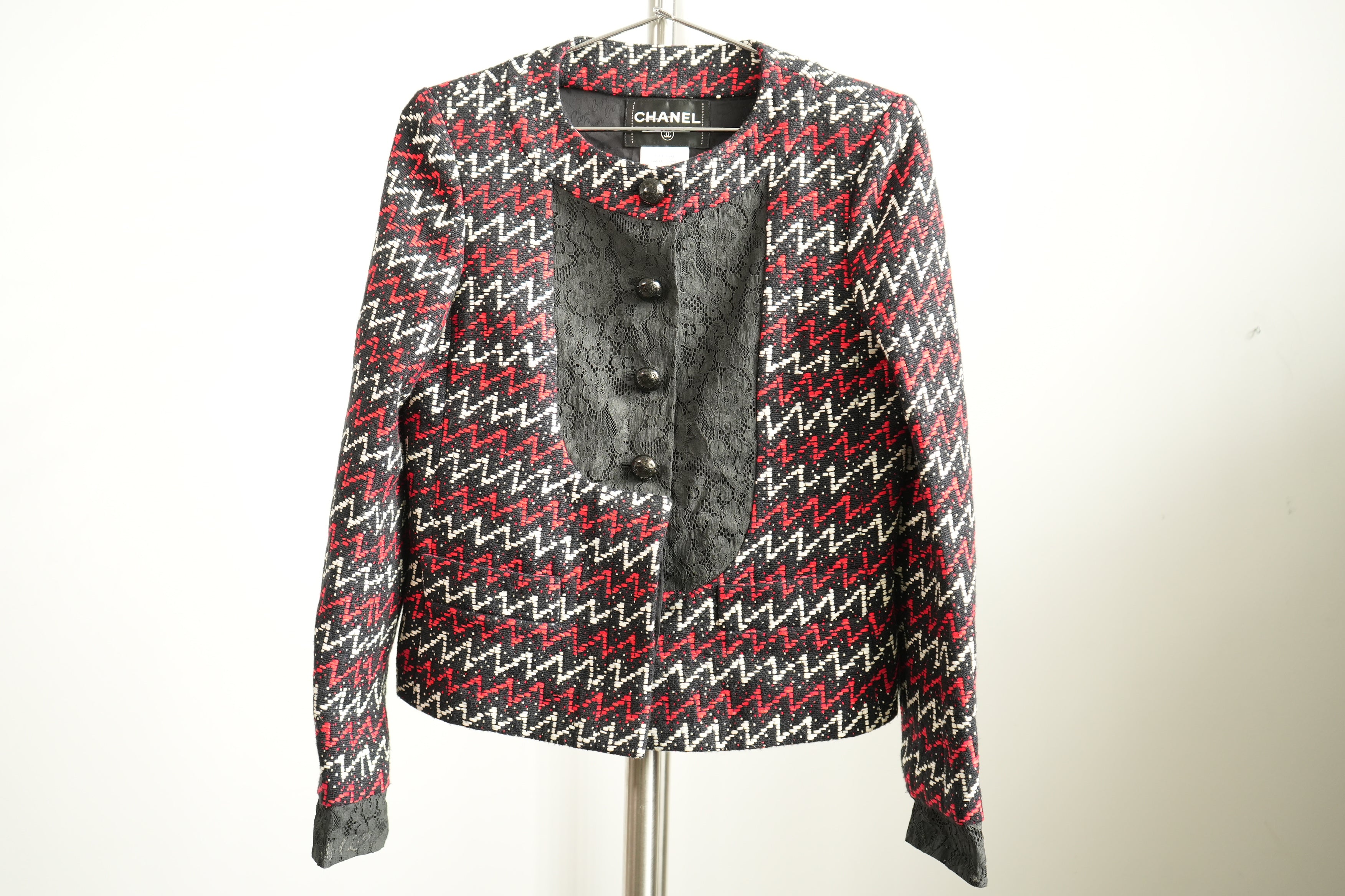 Chanel Zigzag Tweed Lace Panel Collarless Jacket Size 38