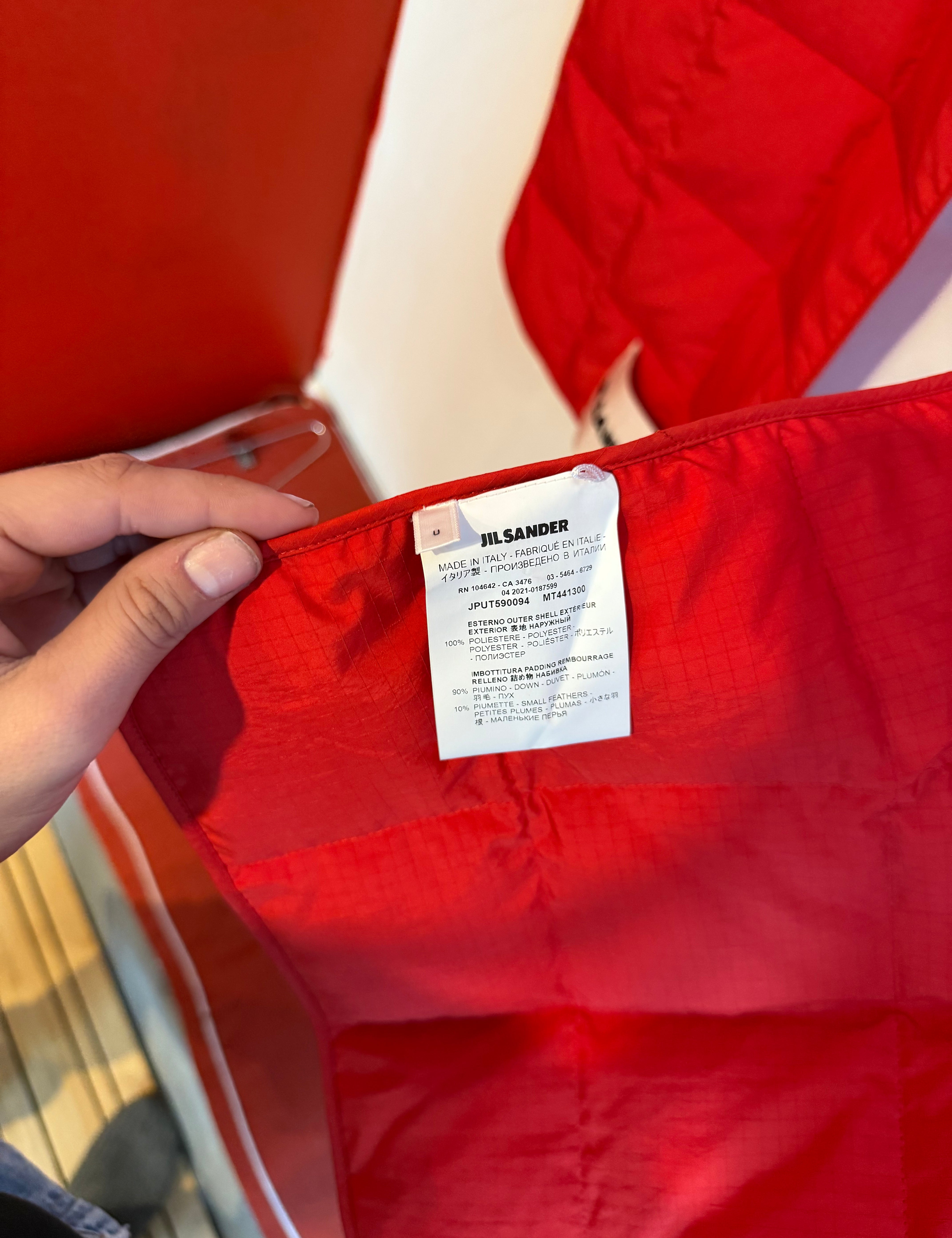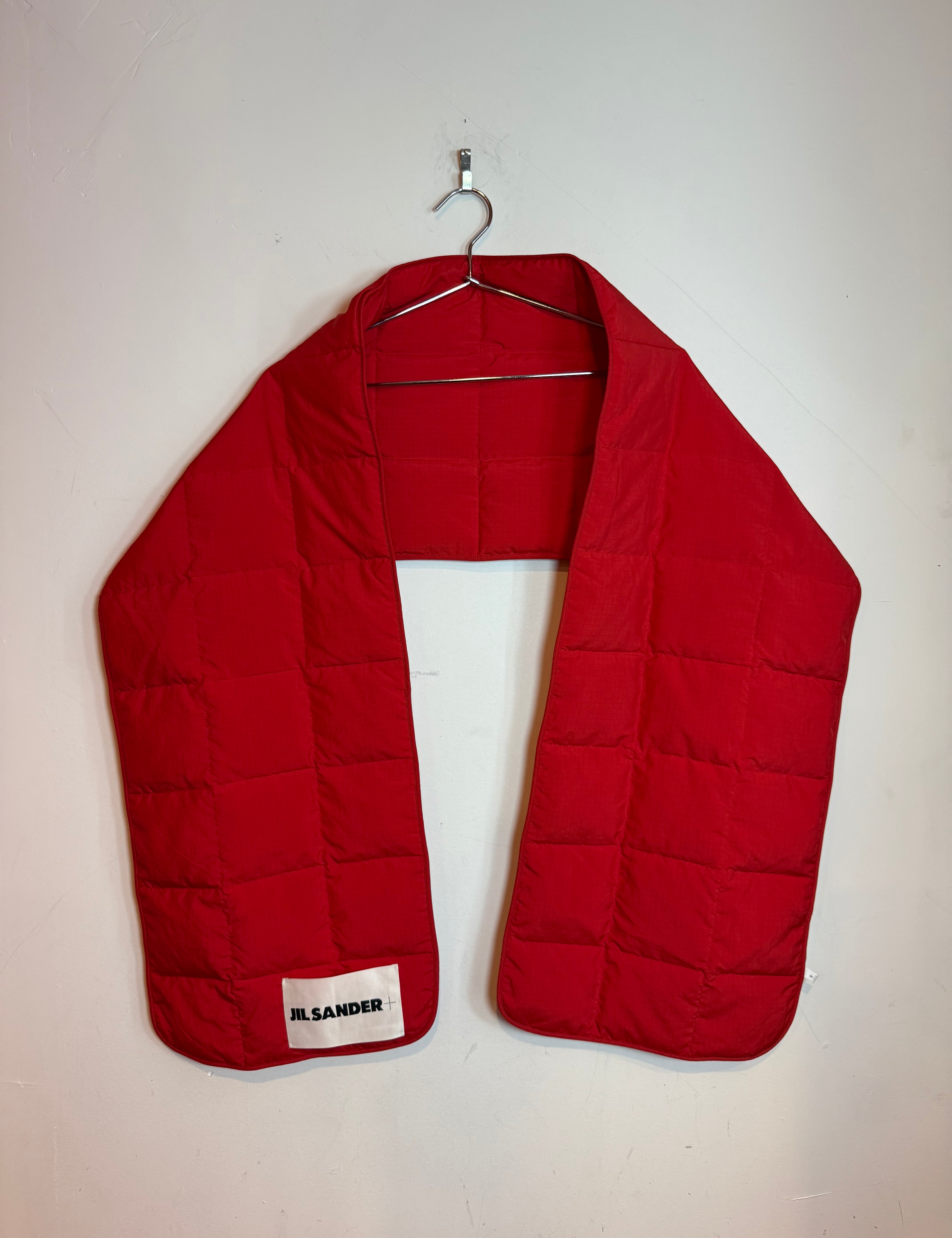 Jil Sander Red Quilted Down Puffer Scarf with Logo Patch