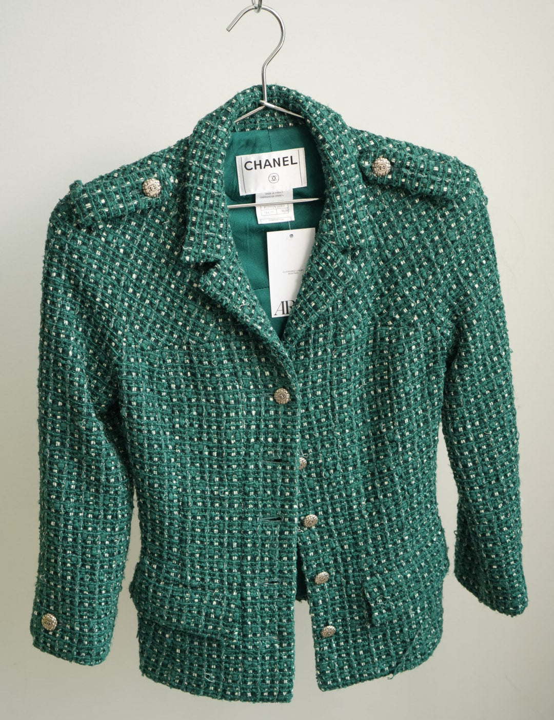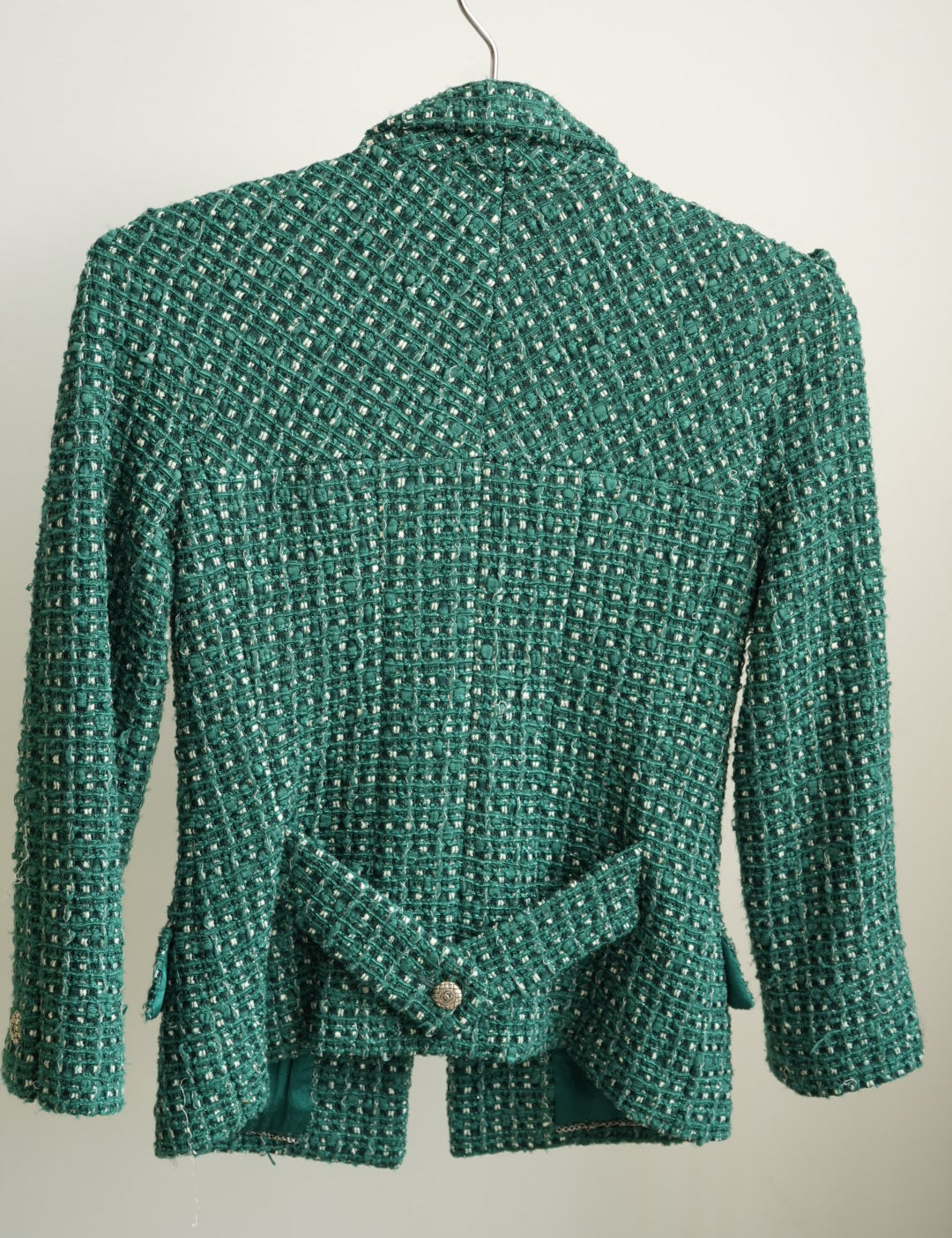 Vintage Chanel Green Tweed Blazer Jacket CC Buttons Shoulder Epaulets Size 36