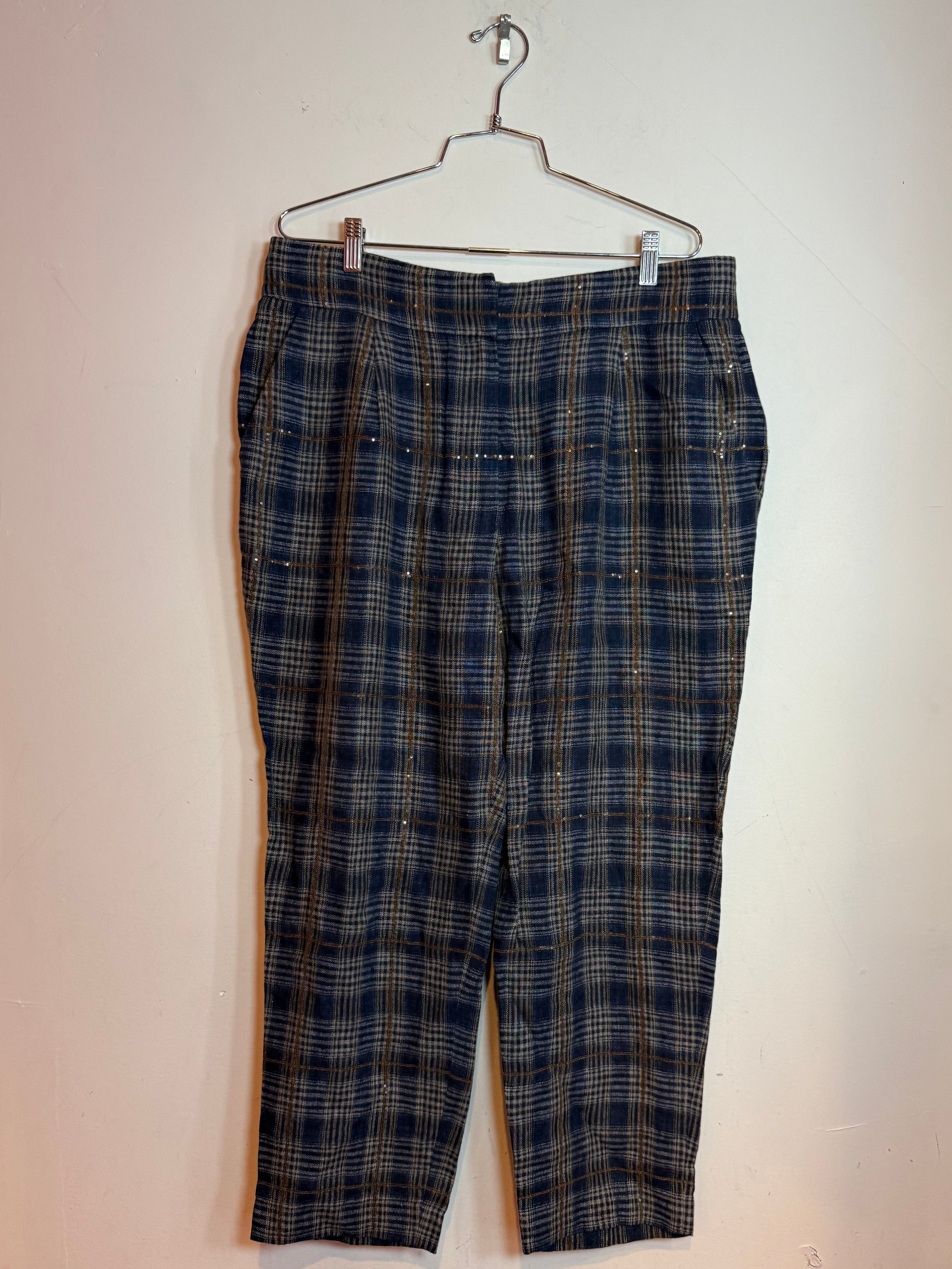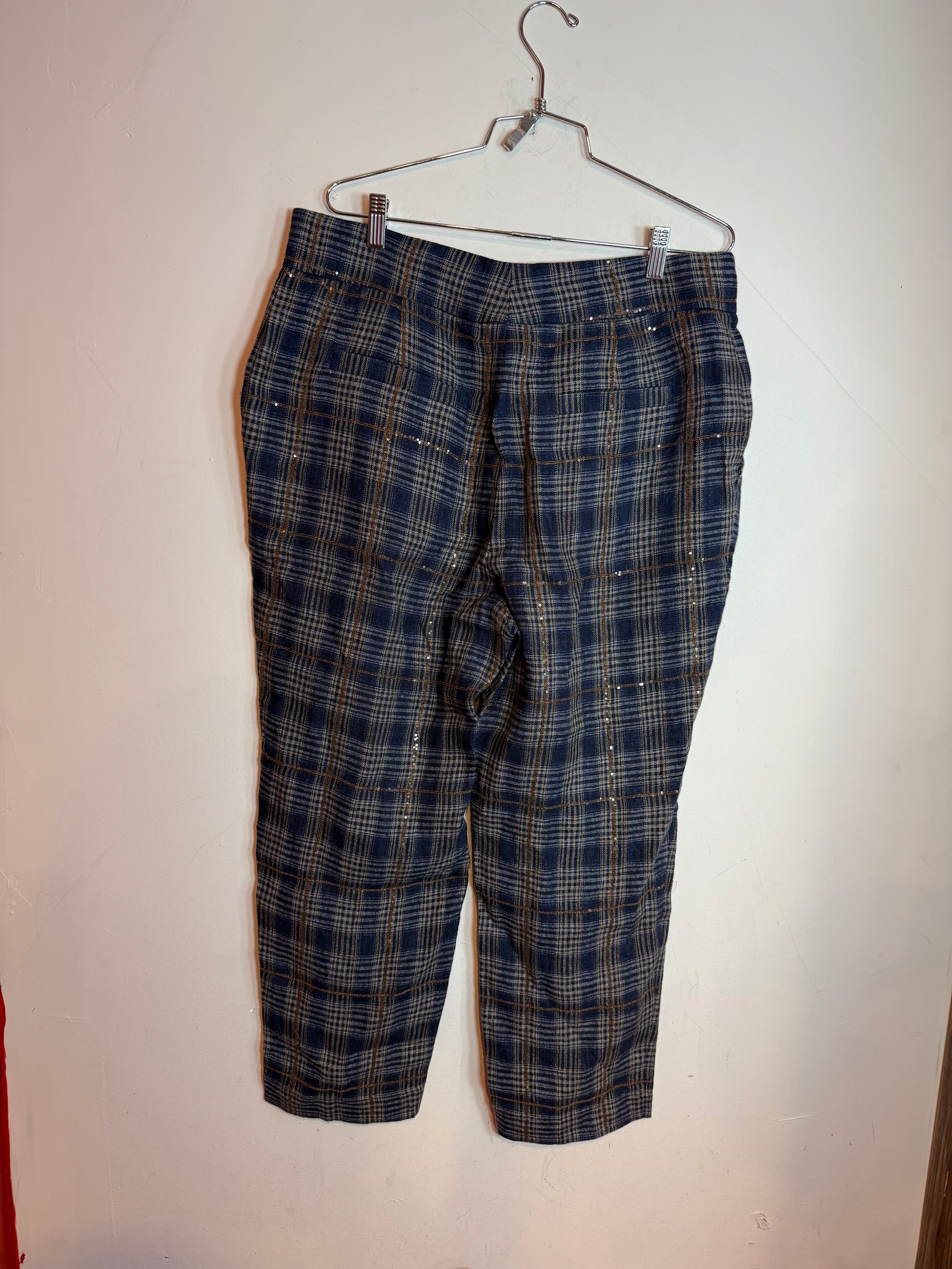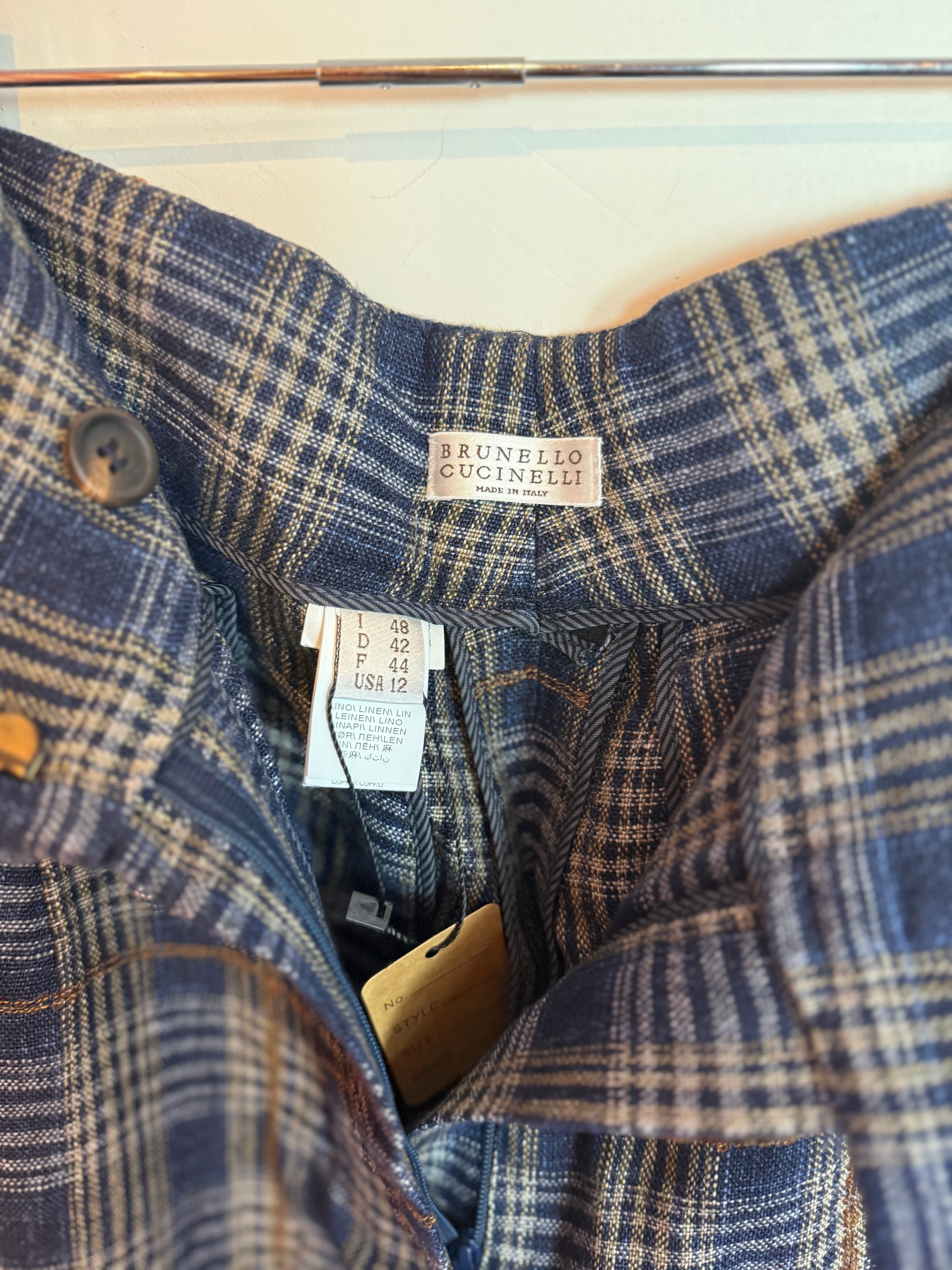 Brunello Cucinelli Plaid Sequin Linen Trousers Blue Brown Size 12