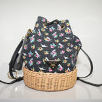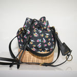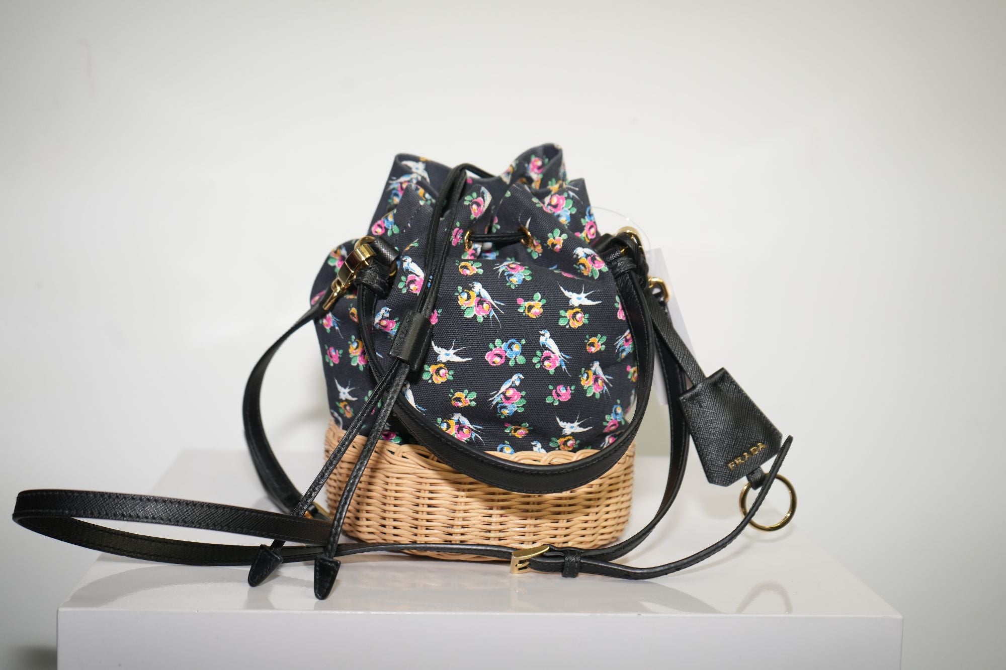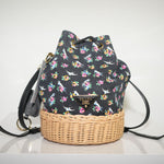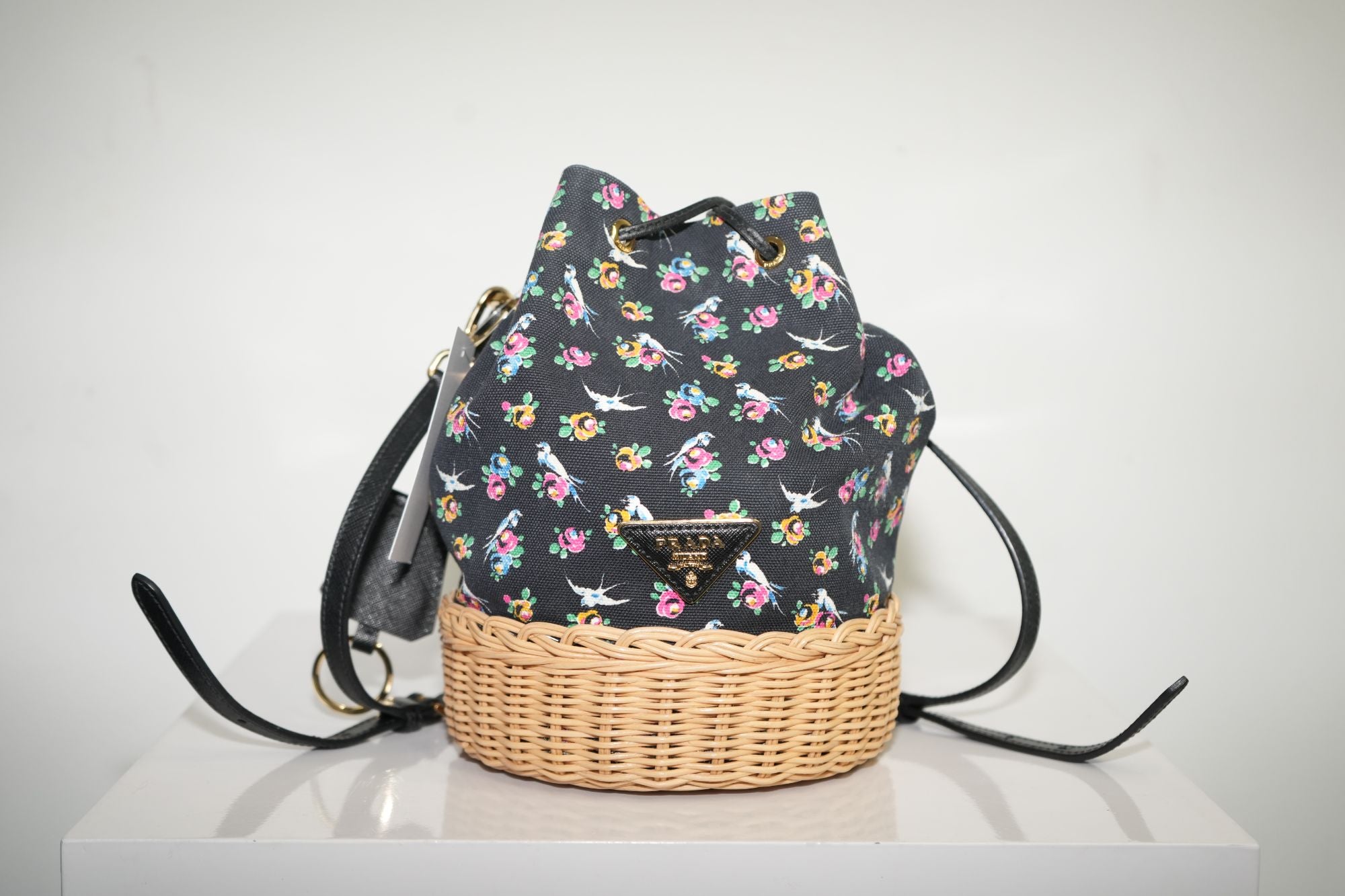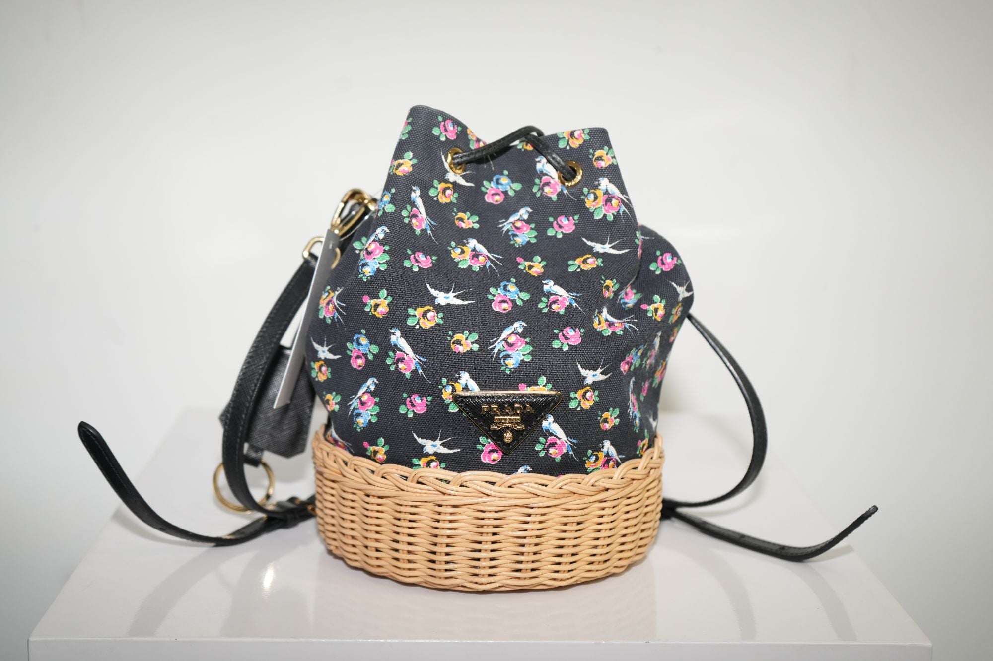Prada Wicker Canvas Floral Bird Print Drawstring Bucket Bag Black