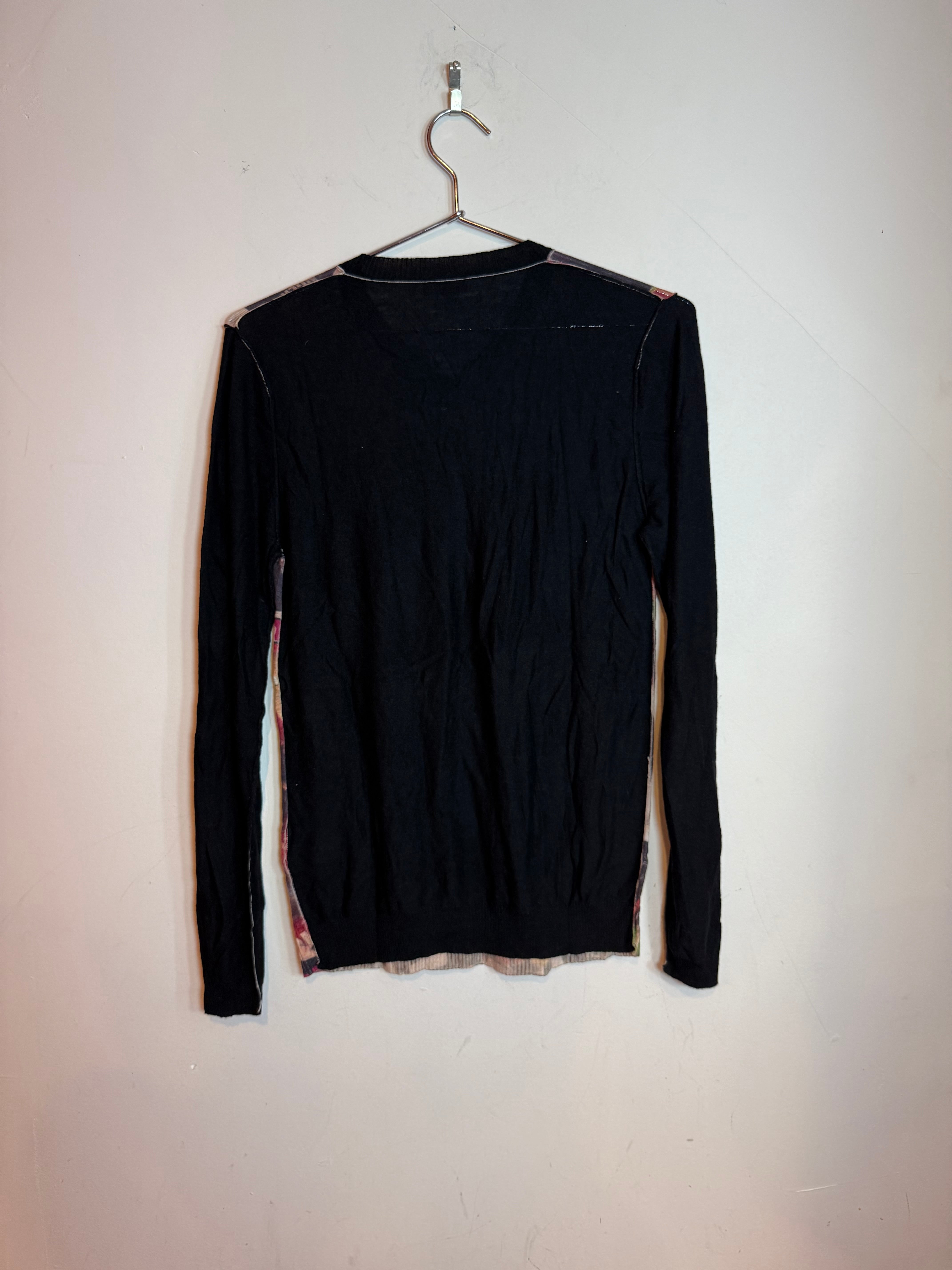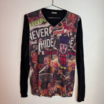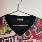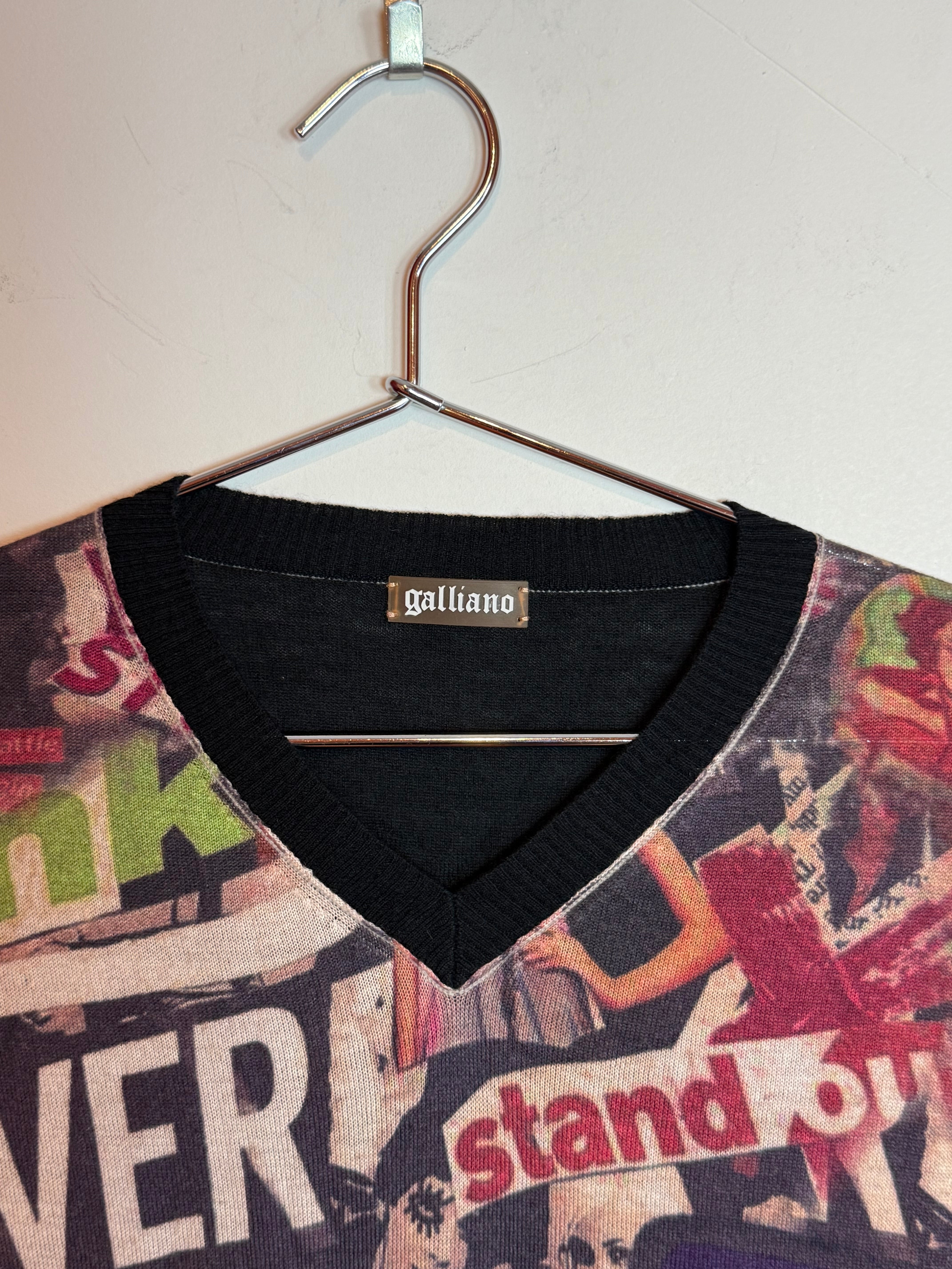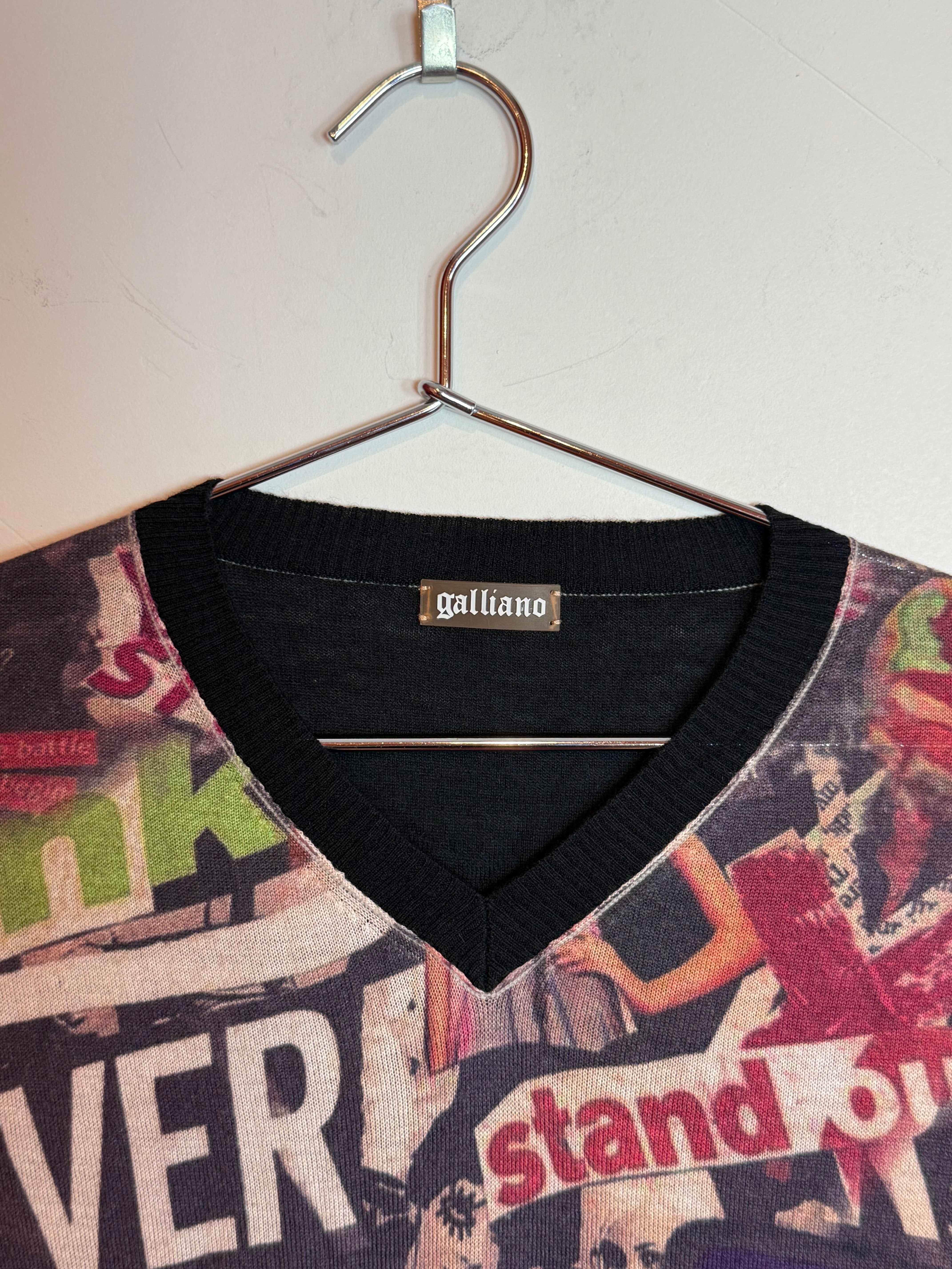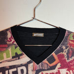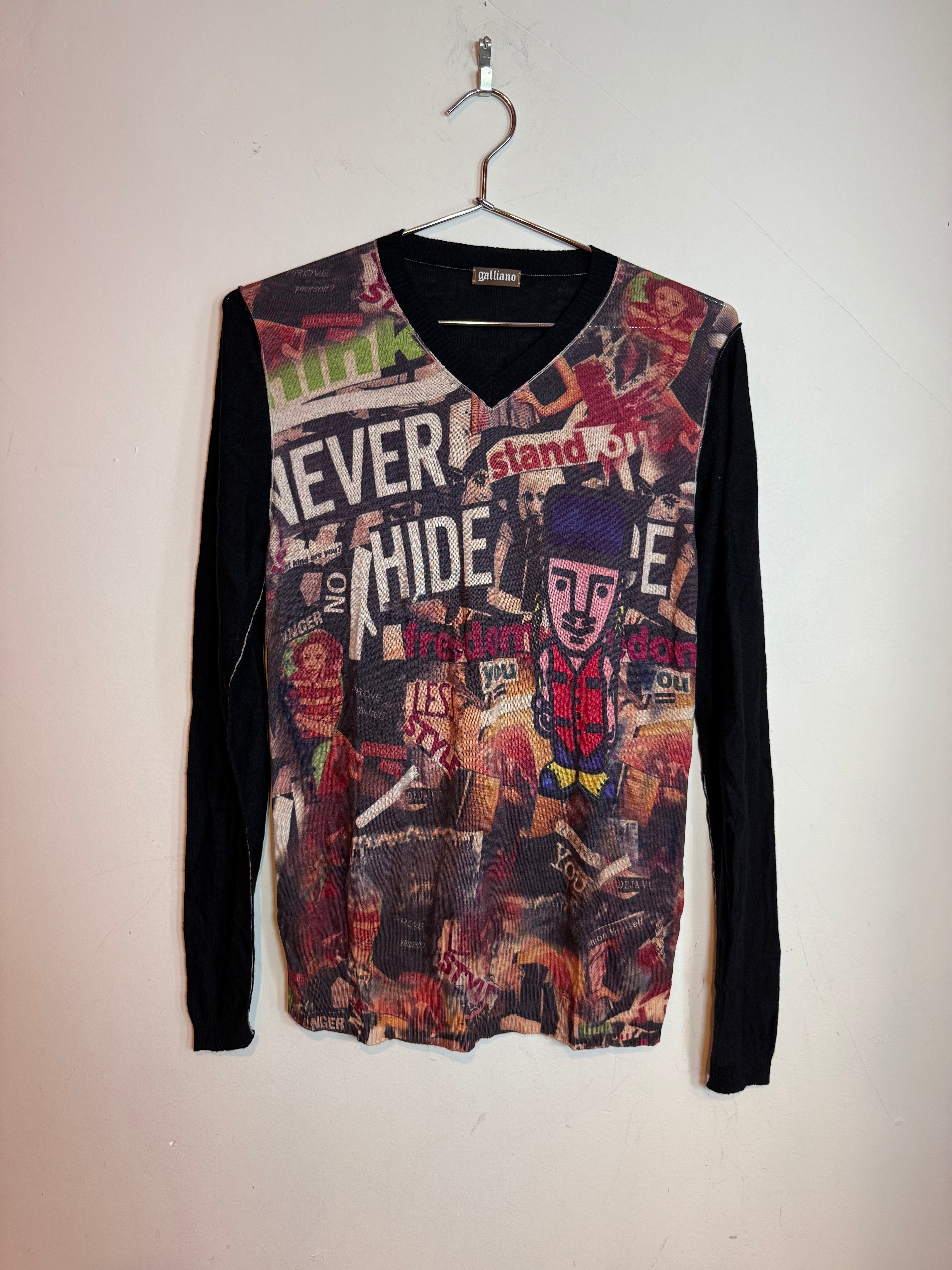 Vintage John Galliano Newspaper Collage Graphic Print Long Sleeve V-Neck Sweater